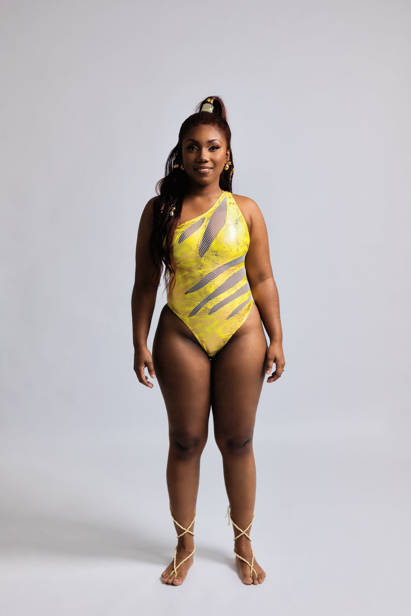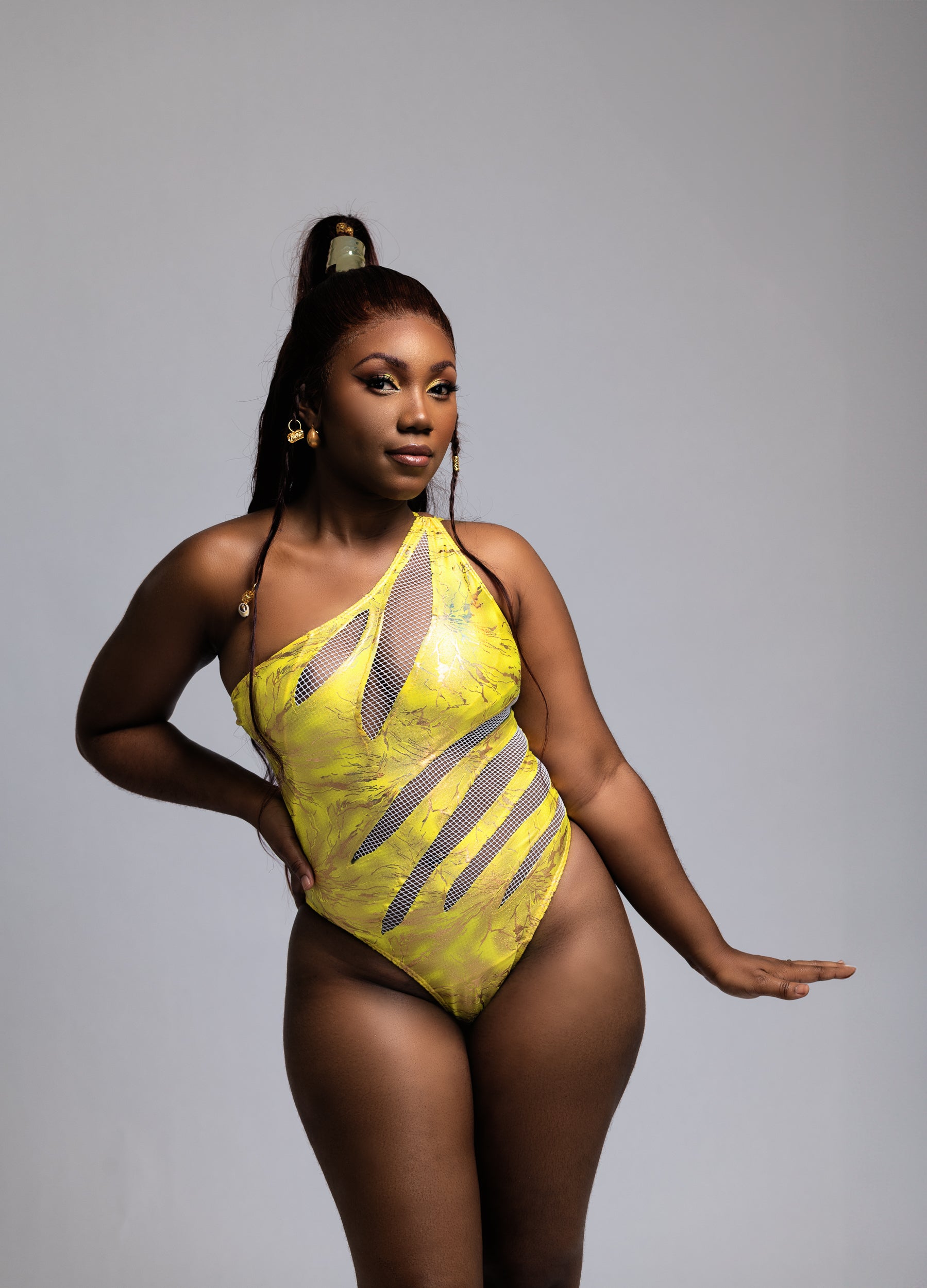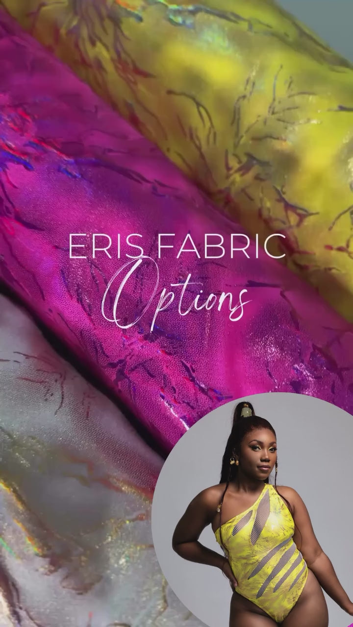 Inspired by the goddess of discord herself, Eris embodies the kind of chaos that turns heads and commands attention. This one-shoulder design fuses metallic yellow tones with daring mesh cutouts — a symbol of beauty and rebellion intertwined.